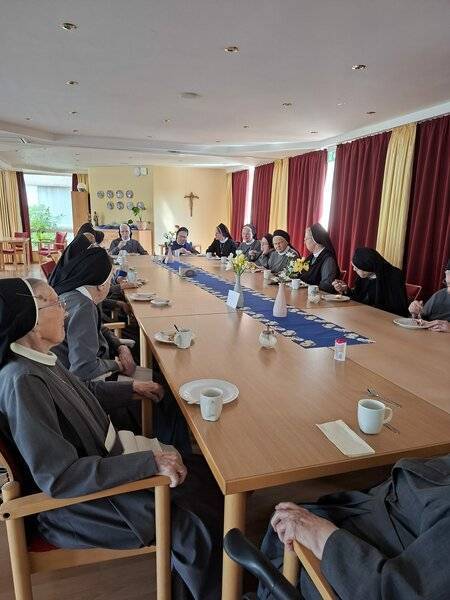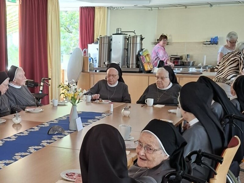 Die Kommunität des St. Josefshauses in Wallenhorst feierte mit Pastor Linkemeyer am Morgen ein festliches Hochamt. Nachmittags wurde die gemeinsame Kaffeetafel kurzerhand in den Saal verlegt, wo engagierte Ehrenamtliche an jedem Freitag Waffeln für die ganze Hausgemeinschaft backen.